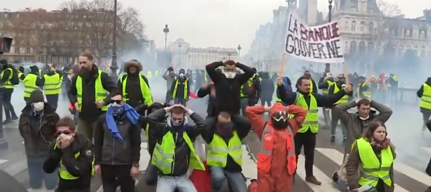 Cette photo prise ce samedi 22 décembre à Paris lors de l’acte VI des Gilets Jaunes est une parfaite illustration de notre travail militant sur qui contrôle quoi : la soumission aux banques ! Elle est aussi à l’image des nombreuses discussions avec les Gilets Jaunes (ou de simples passants non giletés) des dernières semaines : spirale de la dette, austérité, pauvreté de 15 % à 20 % de nos compatriotes… le point commun est l’absence de règles sinon celles au profit de l’oligarchie financière et de ses collaborateurs français.