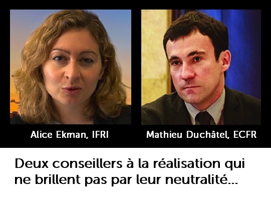Sans surprise Alice Ekman responsable Chine au Centre Asie de l’IFRI et Mathieu Duchâtel de l’ECFR, sont listés parmi les conseillers des réalisateurs. Ekman dont le discours frôle souvent l’hystérie anti-chinoise, a dirigé récemment un ouvrage de l’IFRI consacré aux Nouvelles Routes de la soie qui prône une approche on ne peut plus restrictive à ce projet ; Mathieu Duchâtel s’est fait connaître par sa dénonciation des supposées visées « impériales » de la marine chinoise.