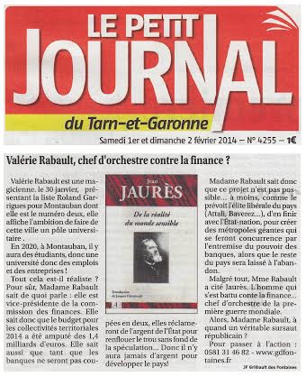 Valérie Rabault est une magicienne. Le 30 janvier, présentant la liste Roland Garrigues (PS) pour Montauban dont elle est le numéro deux, elle affiche son ambition de faire de cette ville un pôle universitaire. (…) Tout cela est-il réaliste ? Bien sûr, Madame Rabault sait de quoi elle parle : elle est vice-présidente de la Commission des finances [de l’Assemblée nationale, ndlr]. Elle sait donc que le budget des collectivités territoriales 2014 a été amputé de 1,4 Mds d’euros. Elle sait aussi que tant que les banques ne seront pas coupées en deux, elles réclameront de l’argent de l’Etat pour renflouer le trou sans fond de la spéculation. Donc il n’y aura jamais d’argent pour développer le pays ! (…) A moins, comme le prévoit l’élite libérale du pays (Attali, Baverez...) d’en finir avec l’Etat-nation, pour créer des métropoles géantes qui se feront concurrence par l’entremise du pouvoir des banques, alors que le reste du pays sera laissé à l’abandon. Malgré tout, Madame Rabault a cité Jaurès, l’homme qui s’est battu contre la finance (...) Alors Madame Rabault, à quand un véritable sursaut républicain ?