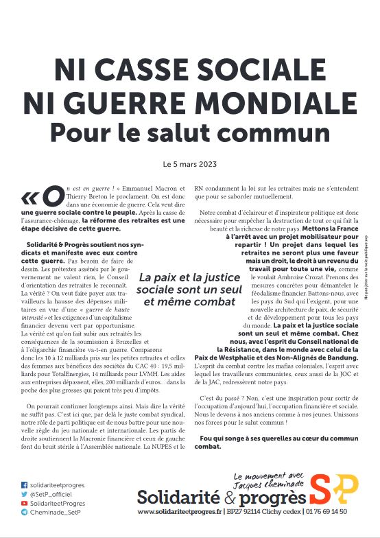 Solidarité & Progrès soutient nos syndicats et manifeste avec eux contre cette guerre.