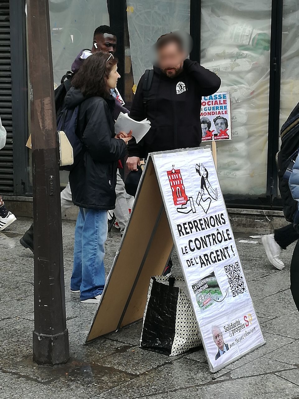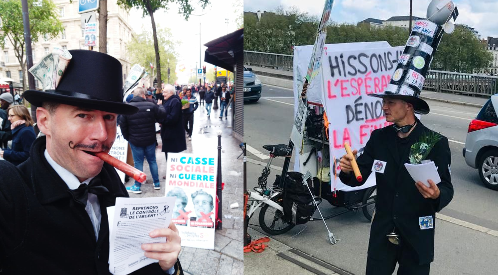 A gauche : à Paris, c’est Sébastien Drochon, qui s’est prêté au jeu en incarnant un grand banquier tenant en laisse son toutou Macron. Il a été interviewé par le média lyonnais veridik.fr ! A droite : Étienne, militant à Nantes avec S&P et les Cercles Citoyens, n’est pas passé inaperçu avec son costume de banquier ! Il a été couvert par le Monde et Ouest-France . Voir les vidéos !