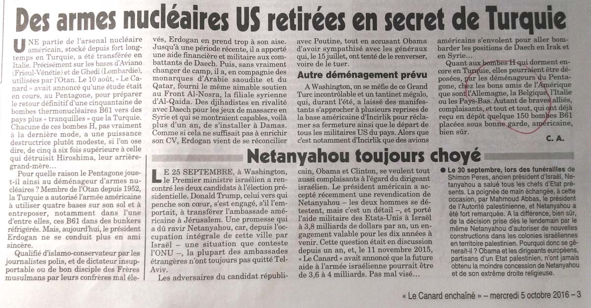 Or, Le Canard Enchainé du 5 octobre 2016 révèle qu’une partie de ces bombes B61 a déjà été transférée en Italie, dans les bases d’Aviato et de Ghedi. Le journal suppose ensuite que le Pentagone répartira l’entièreté du stock chez les quatre alliés européens de l’OTAN, la Belgique, l’Allemagne, l’Italie et les Pays-Bas, où se trouvent déjà quelques 150 de ces bombes thermonucléaires.