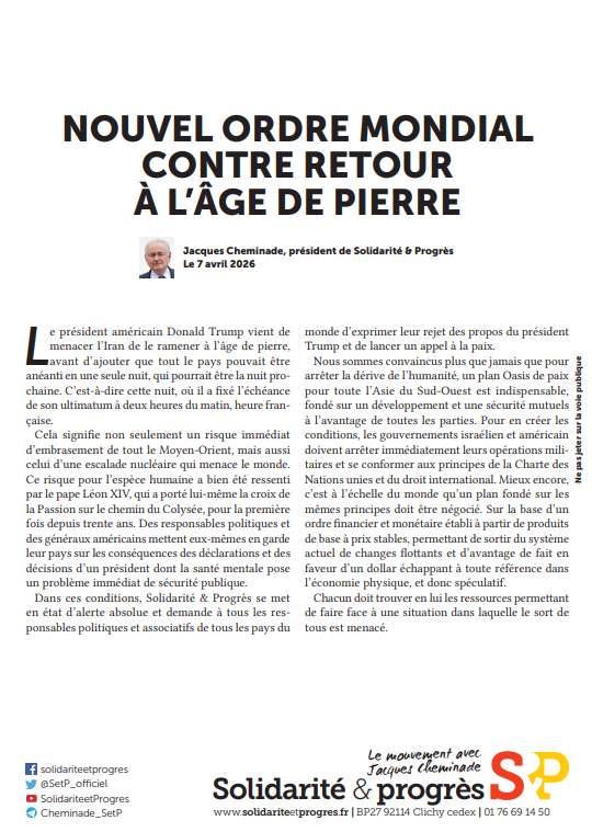 Déclaration de Jacques Cheminade Président de Solidarité & Progrès