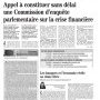 Appel à constituer sans délai une Commission d’enquête parlementaire sur la crise financière