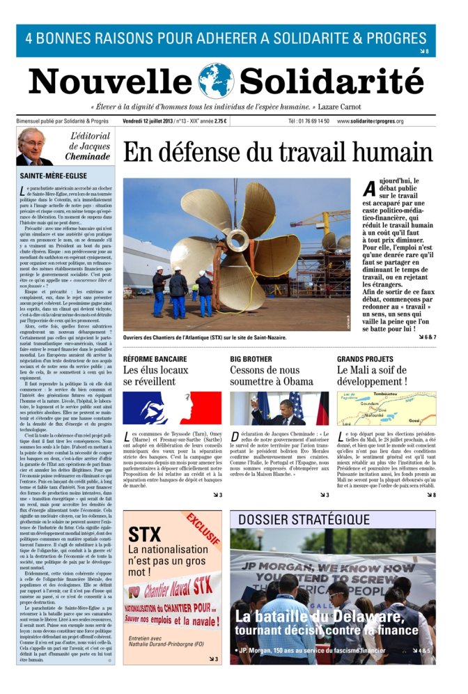 • AFFAIRE SNOWDEN/MORALES : La France doit cesser de se soumettre à l’Administration Obama. Déclaration de Jacques Cheminade : Le refus du gouvernement d’autoriser le survol de notre territoire par l’avion transportant le président bolivien Evo Morales confirme malheureusement mes craintes. Comme l’Italie, le Portugal et l’Espagne, nous sommes empressés d’obtempérer aux ordres de la Maison Blanche ; (p. 3)
