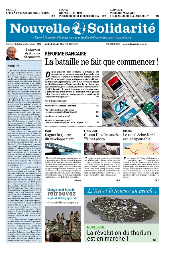 • REFORME BANCAIRE : LA BATAILLE NE FAIT QUE COMMENCER. Depuis plusieurs mois, Solidarité & Progrès a pris contact avec les parlementaires pour les convaincre de remplacer le projet de loi de réforme bancaire présenté par M. Pierre Moscovici, par un projet permettant véritablement de couper les banques en deux (Glass-Steagall Act). Si nombreux sont les élus estimant qu’il est urgent de « durcir » le texte par des amendements, pour l’instant, personne ne semble vraiment décidé à boycotter le projet gouvernemental et encore moins à introduire une proposition de loi alternative. Or, la question qui se pose est la suivante : peut-on amender un projet de loi « intrinsèquement pervers » ? (p. 4) ; ENTRETIEN avec Jacques Cheminade : C’est de système qu’il faut changer ! (p.3) ; La FEDERATION FRANCAISE DES BANQUES toujours en campagne contre Glass-Steagall (p. 4). AUDITIONS : le terrible aveu ? (p. 4) ; COUPER LES BANQUES EN DEUX ? Les précédents français de 1945 et belge de 1934 (p.5) ; Belgique. DOCUMENT : Arrêté royal relatif à la protection de l’épargne et à l’activité bancaire (22 août 1934) ; A SIGNER : L’APPEL à un Glass-Steagall global (p. 16).