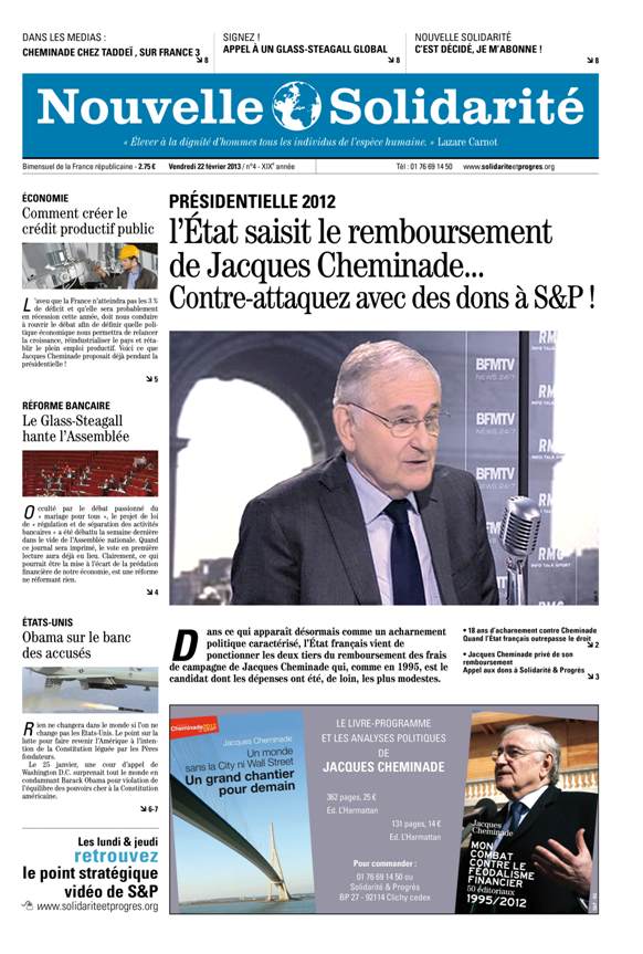 • L’ETAT SAISIT LE REMBOURSEMENT DE JACQUES CHEMINADE… CONTRE-ATTAQUEZ AVEC DES DONS A SOLIDARITE & PROGRES ! Dans ce qui apparaît désormais comme un acharnement politique caractérisé, l’Etat français vient de ponctionner les deux tiers du remboursement des frais de campagne de Jacques Cheminade qui, comme en 1995, est le candidat dont les dépenses ont été, de loin, les plus modestes. Cette « compensation » est effectuée, officiellement, dans le but de récupérer les 153 000 euros (plus les intérêts) versés par l’Etat en 1995 au titre de l’avance forfaitaire que perçoivent les candidats ayant obtenu leurs 500 parrainages. Communiqué de Solidarité & Progrès (p. 3).