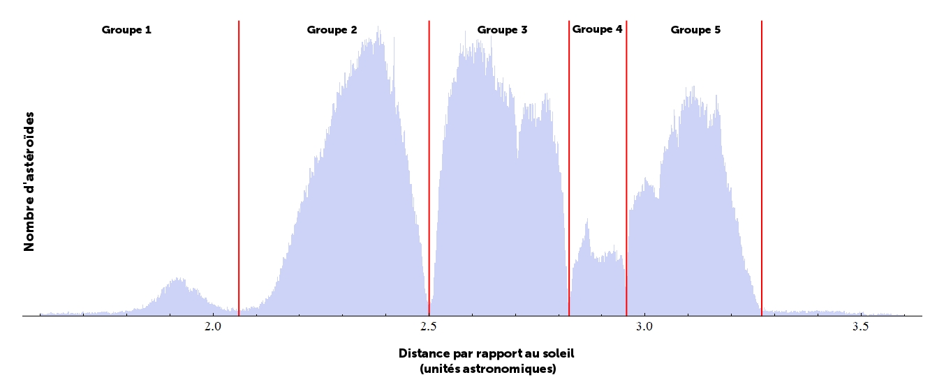 Voici la première constatation qui s’impose d’elle-même (voir figure 1) : les astéroïdes se répartissent selon des aires bien délimitées sur cet histogramme. L’axe horizontal correspond à la distance moyenne de chacun d’entre eux par rapport au Soleil. On voit par exemple que lorsque cette valeur vaut deux fois et demi la distance de la Terre au Soleil, il n’y a aucun astéroïde présent. Ces espaces qui apparaissent entre les aires s’appellent les lacunes de Kirkwood, du nom de l’astronome qui les a découverts. Entre ces lacunes se trouvent des paquets d’astéroïdes. Cherchant des moyens d’étudier les astéroïdes par groupes séparés, nous avons donc trouvé ici un moyen de les diviser en cinq groupes. Nous espérions trouver ainsi une approche possible à notre problème initial.