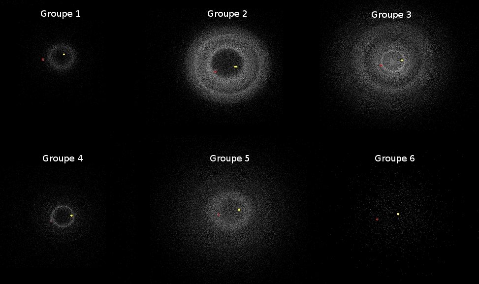 Observons une fois de plus sur cette autre animation (animation 5 : cliquez ici) la formation des anneaux, mais cette fois-ci avec le graphique des différents groupes classés suivant les distances moyennes en écusson en haut à gauche, et en effectuant plusieurs pauses pour faire apparaître et dessiner les cercles plus nettement. Ces derniers, d’ailleurs, sont peut-être des ellipses de très faible excentricité, qui sait ? C’est pour l’instant très difficile à vérifier.