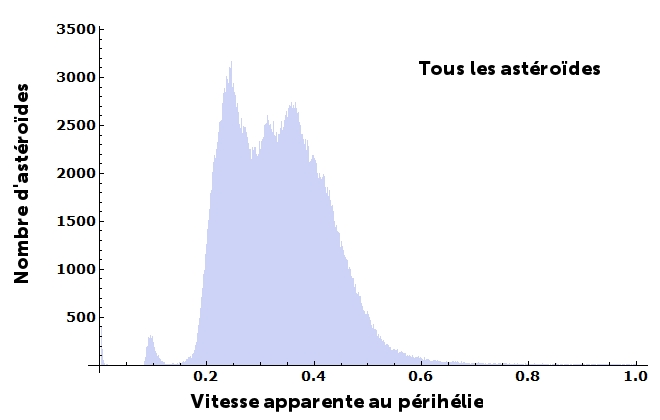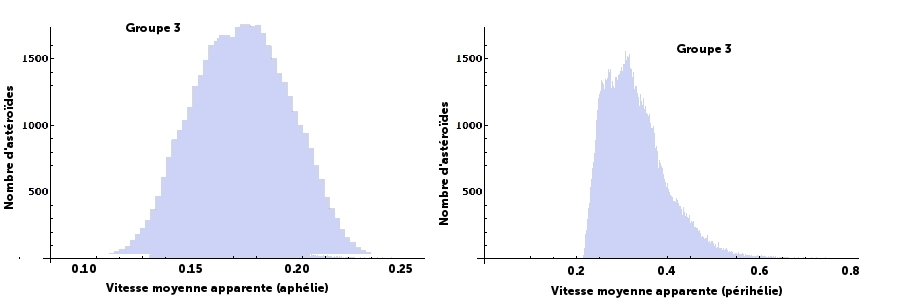 Si on considère l’ensemble de tous les astéroïdes, il y a certaines caractéristiques pour lesquelles il ne semble pas exister de moyenne commune. C’est le cas de leur vitesse moyenne lorsqu’ils sont au point le plus proche du Soleil (figure 2). On voit différents pics sur l’histogramme mais pas de caractéristique pour l’ensemble de la ceinture d’astéroïdes. Cependant, si l’on considère un des cinq groupes indépendamment des autres on voit que c’est davantage le cas : il existe une sorte de vitesse minimale moyenne (aphélie) et une sorte de vitesse maximale moyenne (périhélie) (figures 3a à gauche et 3b à droite).