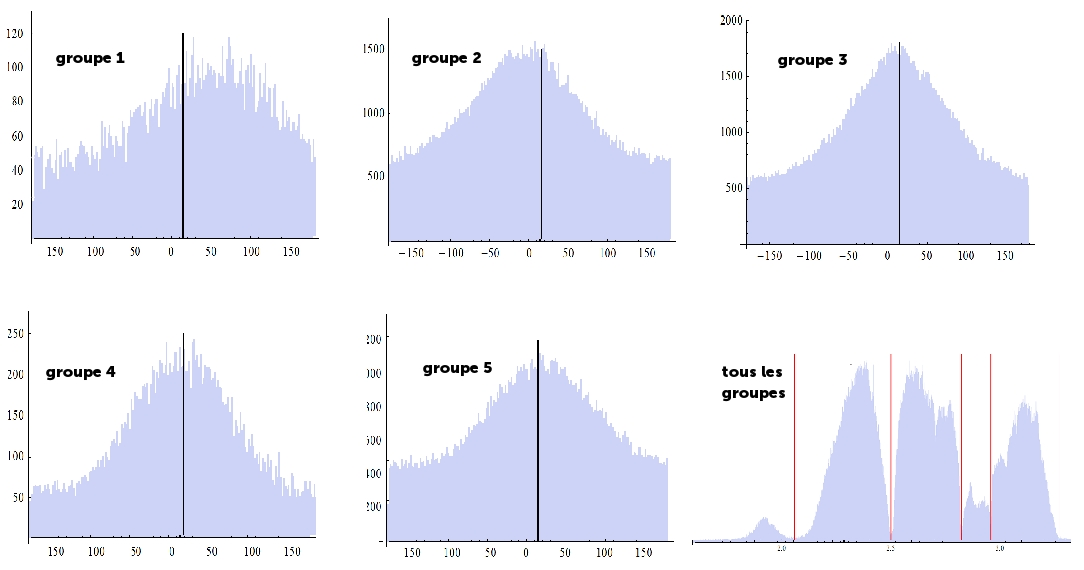 Ces histogrammes montrent donc à quelle position en degré sur l’écliptique les astéroïdes sont le plus près du Soleil. Vous pouvez voir qu’à chacun des cinq groupes qui sont, rappelons-le séparés par les lacunes de Kirkwood, correspond indiscutablement un pic : ils ont tous une direction vers laquelle il est le plus probable de trouver les périhélies. Et cette direction est à peu près la même. La ligne noire que nous avons tracée sur chacune des figures indique le périhélie de Jupiter. Cela n’est peut-être pas très surprenant du fait que Jupiter est un très gros objet et relativement près d’eux, mais il semble bien que ces astéroïdes ont quelque chose en commun avec la direction moyenne de Jupiter.