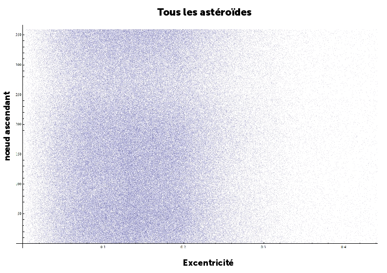 Ceci étant posé, nous avons commencé à essayer de chercher toutes les corrélations que nous pouvions trouver entre tous les astéroïdes possibles. En voici une qui ne montre pas grand-chose (voir figure 5) : les deux axes correspondent respectivement à l’excentricité et à la longitude du nœud ascendant. Il n’y a rien de remarquable dans ce nuage de points.