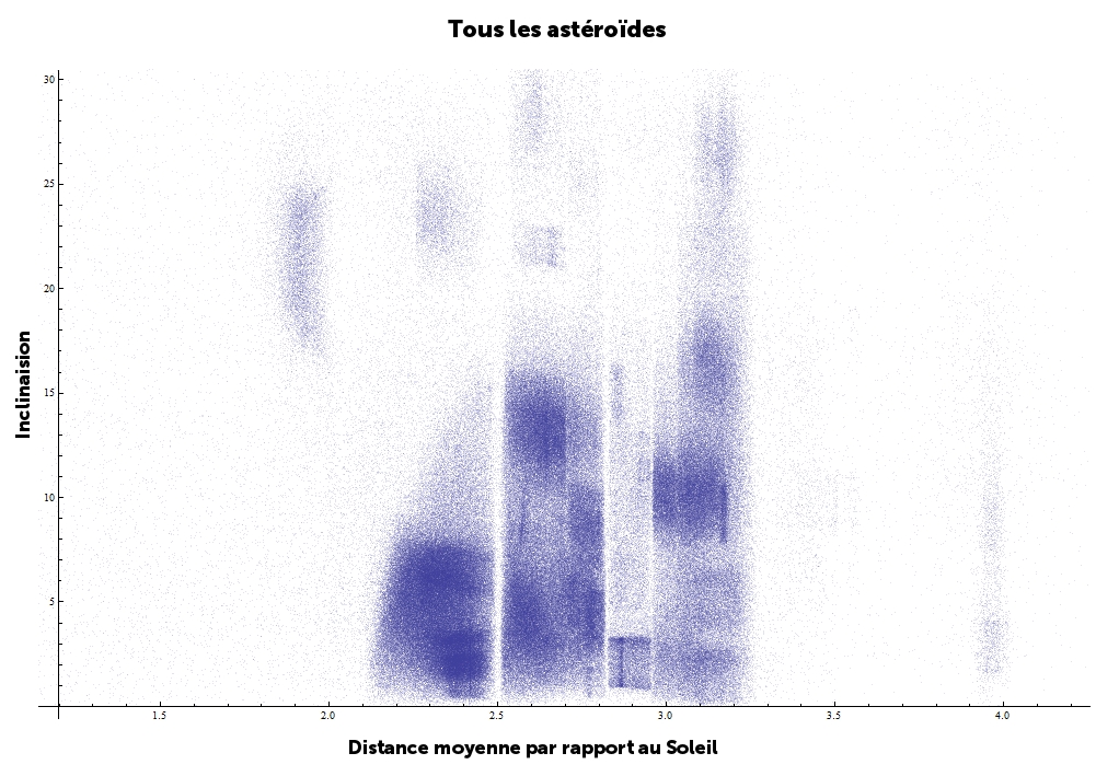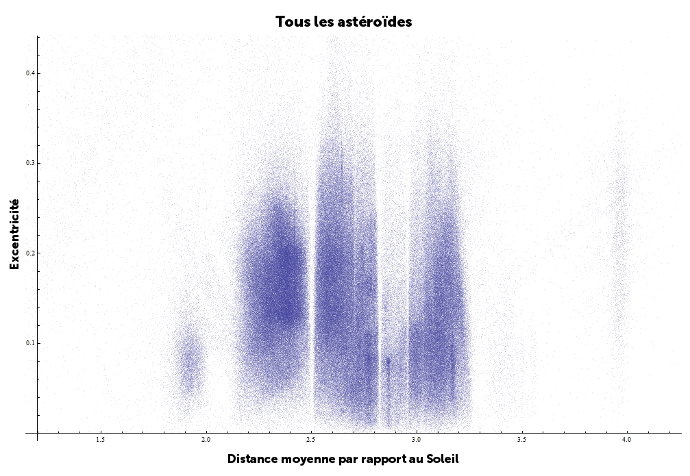 Par contre, comme nous l’avons vu sur l’histogramme précédent, cinq groupes se détachent nettement si l’on s’intéresse à la distance moyenne. Il y a des lacunes et des pics. On voit, par exemple, que beaucoup d’astéroïdes ont une distance moyenne de l’ordre de 2,3 fois la distance Terre-Soleil alors que très peu ont une distance moyenne de 2,5.