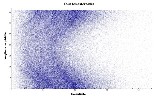 Ce qu’il est bon de préciser et que je n’ai pas fait ici, c’est la direction du périhélie de Jupiter, qui est de 15 degrés, correspondant à la partie la plus sombre du graphique en bas, alors que la longitude de son aphélie, de 195 degrés, correspond à la zone au centre où l’excentricité des astéroïdes tendent vers un minimum. Il semble donc dans un premier temps que ces astéroïdes subissent une forte influence de Jupiter, et qu’ils tendent à s’aligner suivant la direction de son périhélie. Mais cela n’explique pas pourquoi on distingue alors ces franges plus sombres.