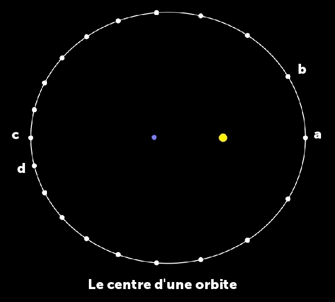 Nous pourrions utiliser le centre géométrique de l’orbite elliptique, mais cela serait peu judicieux car il ne correspondrait à rien de tangible. Au lieu de cela nous utiliserons ce qu’on appelle le centre de masse, reprenant la technique du grand mathématicien allemand Carl Gauss qui, pour comparer comment les différentes planètes s’influençaient les unes des autres, au lieu d’additionner leurs influences respectives point par point pour décrire leur mouvement et vitesse respectifs, privilégia l’idée que l’orbite devait physiquement représenter une distribution de la masse de la planète, une sorte d’anneau plus dense aux endroits où la planète est la plus lente et plus éloignée du Soleil, et moins dense là où elle se déplace plus rapidement.