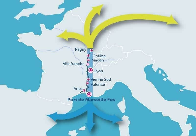 - via le réseau des plateformes multimodales Medlink sur l’axe Rhône-Saône (Pagny, Chalon-sur-Saône, Mâcon, Villefranche-sur-Saône, Lyon, Vienne-Sud, Valence, Avignon-Le Pontet et Arles), l’accès est direct vers Lyon et le centre de l’Europe, ce qui épargne cinq jours de navigation par rapport aux ports du nord de l’Europe (en outre, Marseille ne pâtit pas d’obstacles montagneux, contrairement aux ports italiens et espagnols).