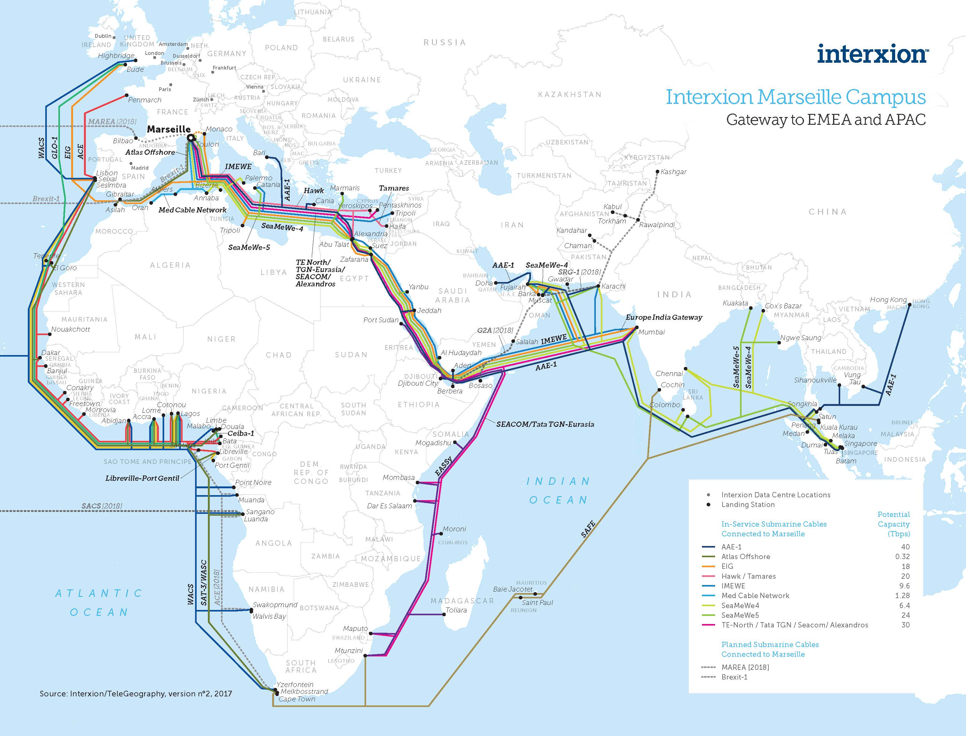 Sur une carte, Marseille est la ville parfaite. Des câbles sous-marins déployés sur près de 20000 kilomètres partent de la ville pour relier l’Europe du Sud et l’Afrique, mais aussi le Proche-Orient et l’Asie. C’est un peu l’équivalent numérique d’un nœud ferroviaire ou autoroutier. Les données sont obligées de transiter par là avant de rejoindre leur destinataire. Ce ce qu’a bien compris la société néerlandaise Interxion, leader européen des data centers, qui vient d’inaugurer le 16 mai son deuxième établissement à Marseille, baptisé « MRS2 » et compte bien faire de Marseille un grand hub numérique mondial.