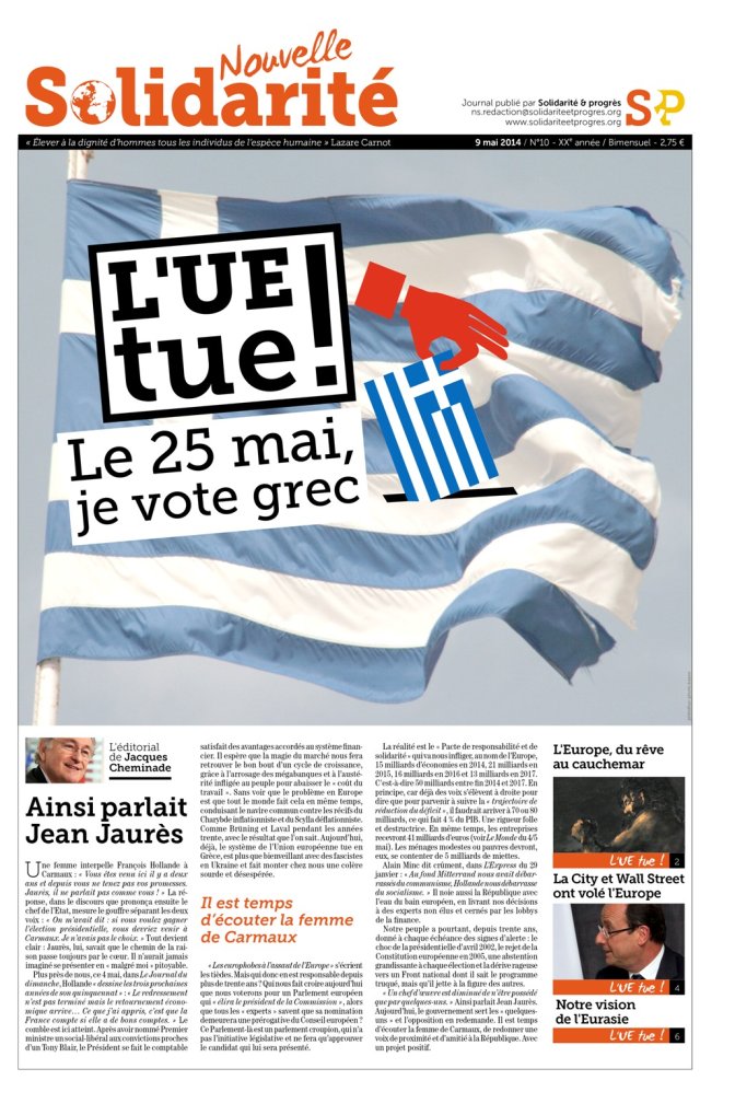- FRANCE : Le recto du tract-bulletin de vote à commander auprès de Solidarité & Progrès où figure (au verso) le drapeau grec à mettre dans l’urne le 25 mai pour exprimer votre cri de colère contre une UE à la solde des prédateurs financiers et de l’OTAN. (p. 1 et 8)
