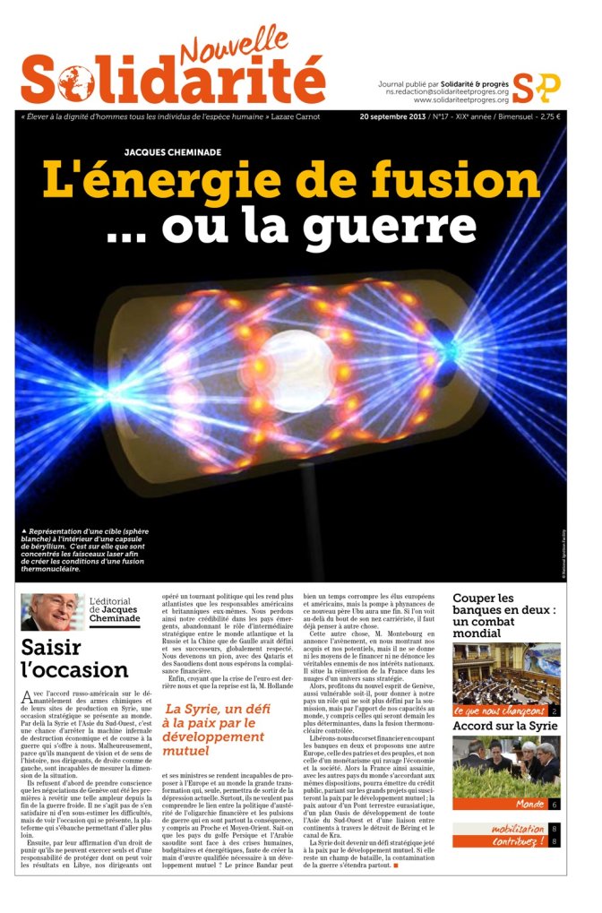 • JACQUES CHEMINADE : L’ÉNERGIE DE FUSION... OU LA GUERRE. Voici l’alternative à la guerre proposée par Jacques Cheminade lors de sa réunion de rentrée, le 5 septembre. L’occasion de vous présenter ce qu’est réellement la fusion nucléaire et ce qu’elle offrira à l’humanité.