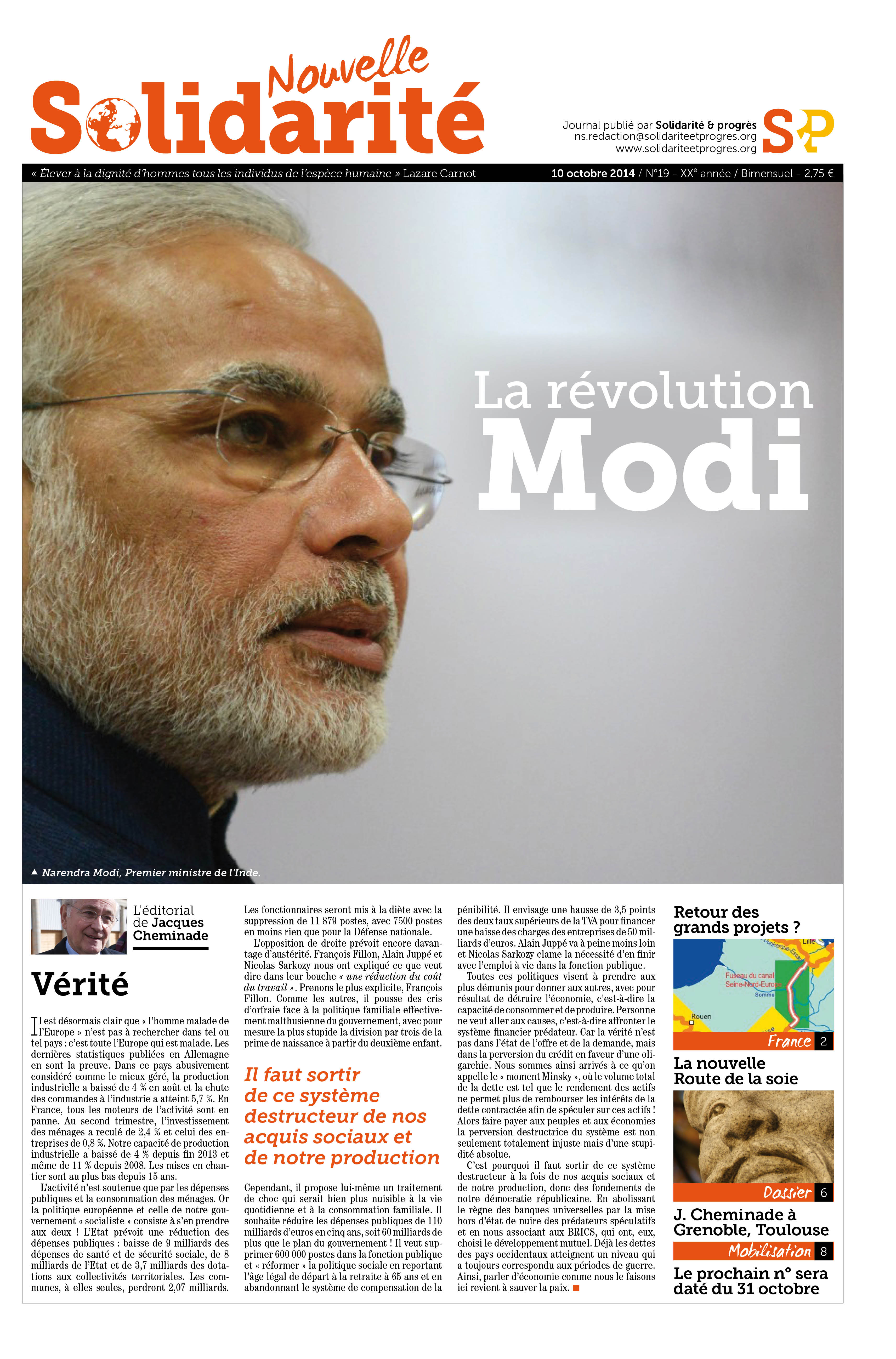 - INDE : LA RÉVOLUTION MODI. Alors que l’ancien président français Nicolas Sarkozy, lors de son passage sur France 2, n’a pas pu s’empêcher, devant huit millions de téléspectateurs, de se moquer du candidat Jacques Cheminade, accusé de vouloir organiser un « débarquement sur Mars », le Premier ministre indien Narendra Modi a honoré de sa présence, le 24 septembre, le centre spatial indien pour suivre en direct, après dix mois, l’insertion réussie du vaisseau Mars Orbiter Mission (MOM) en orbite martienne.