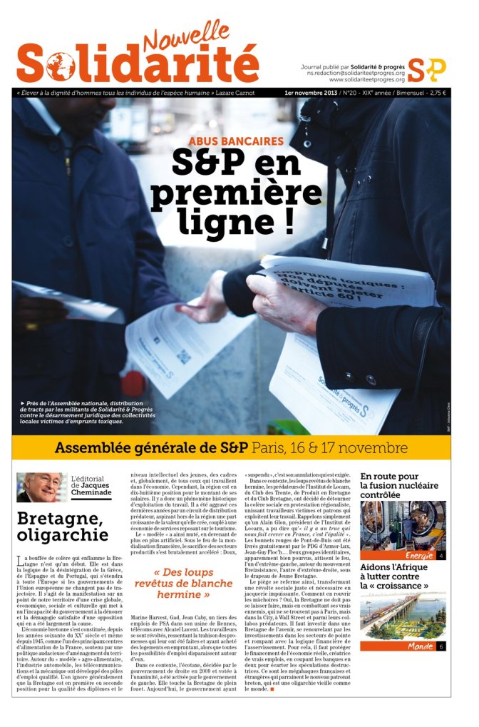 • ABUS BANCAIRES : S&P en première ligne ! La campagne de Solidarité & Progrès pour exiger des parlementaires qu’ils rejettent l’Article 60 du projet de loi de finances 2014 prend de l’élan. En signant notre pétition en ligne, citoyens et élus ont commencé à envoyer un message clair aux parlementaires : la France n’est pas une République bancaire ! (p. 2-3)