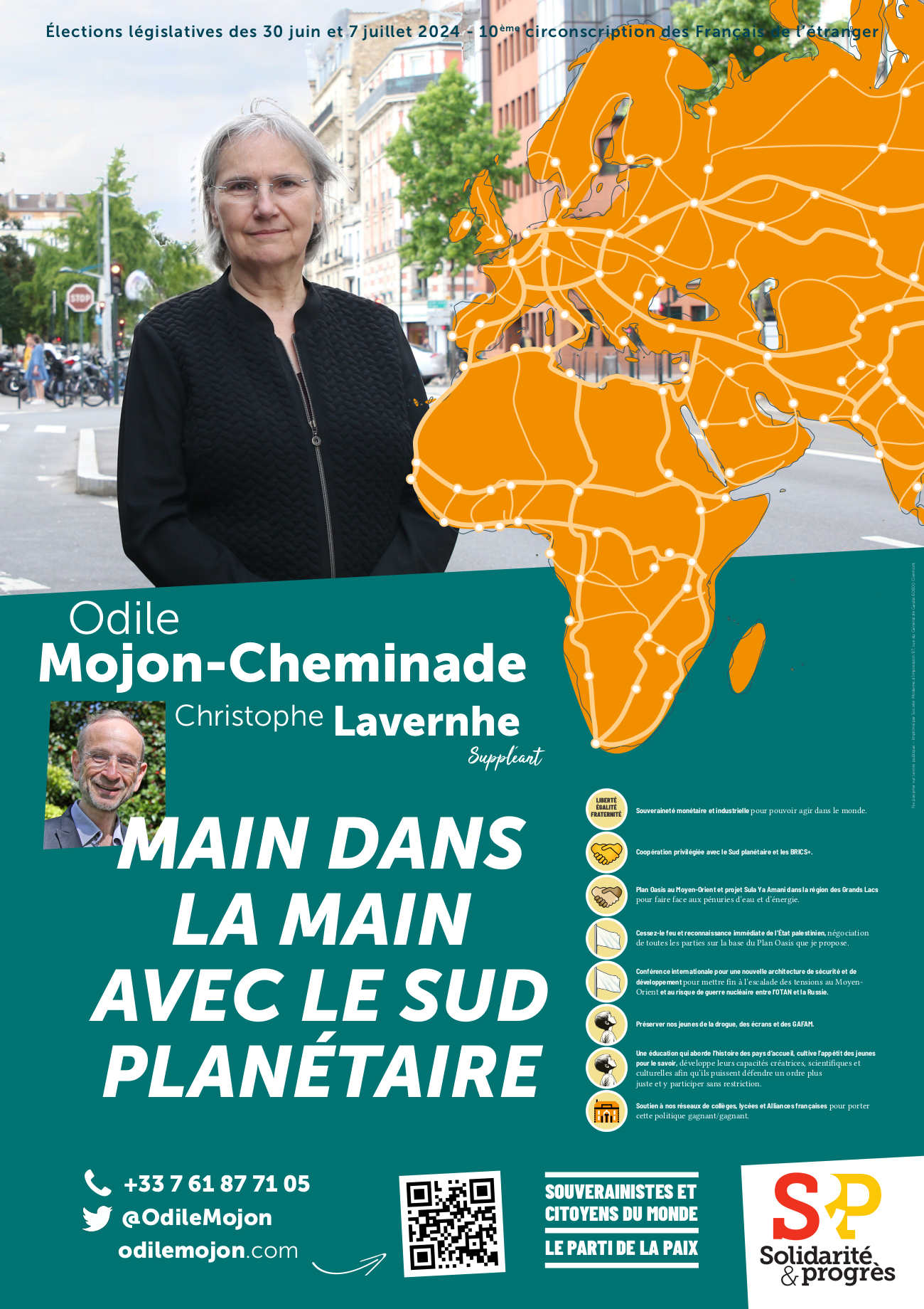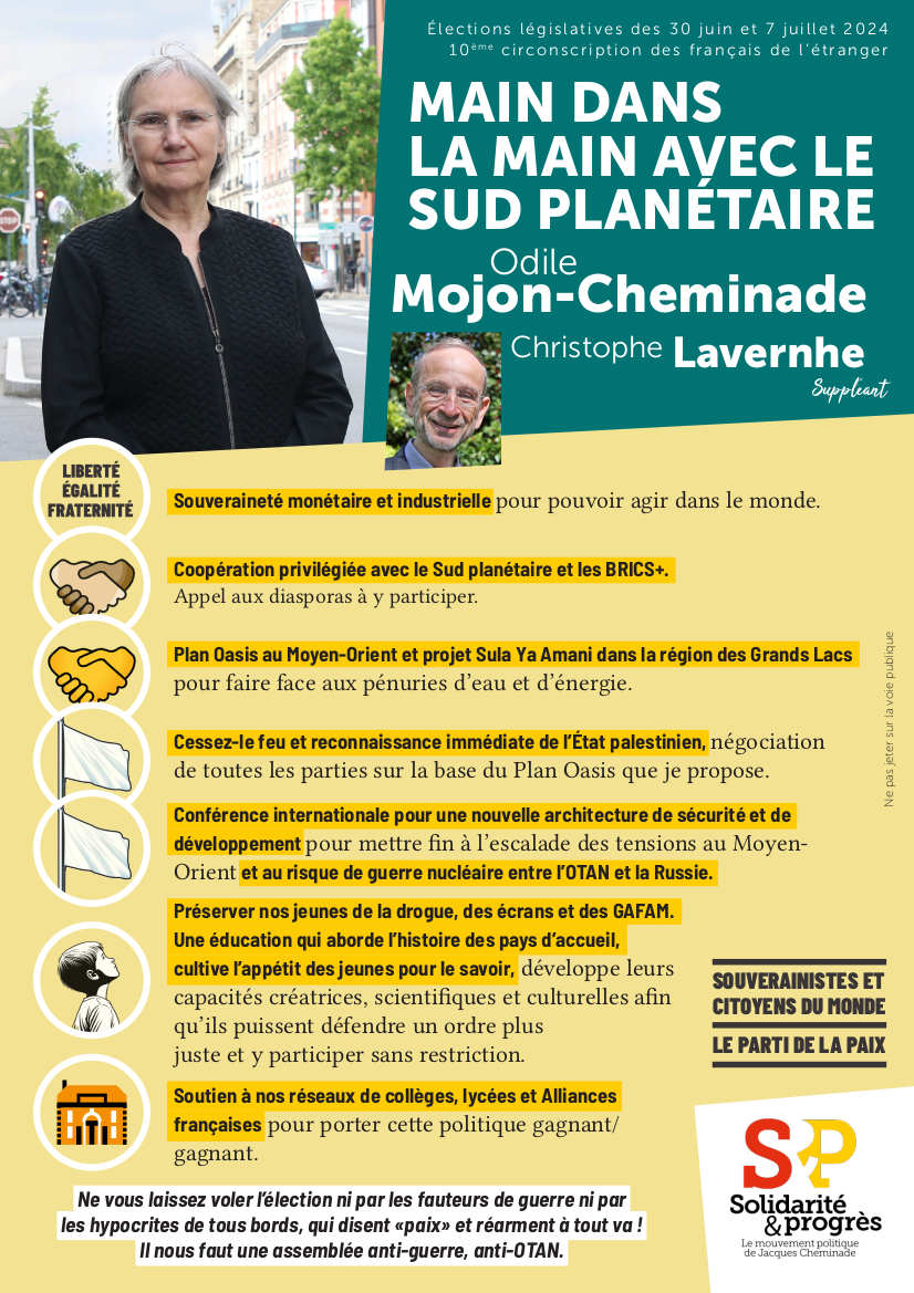 Si je suis candidate dans la 10ème circonscription des Français de l’étranger, c’est d’abord pour promouvoir une politique de paix – aujourd’hui d’une extrême urgence – sachant que pour être viable sur le long terme, elle doit être ancrée dans le développement des infrastructures civiles des pays, pour le bien des peuples.
