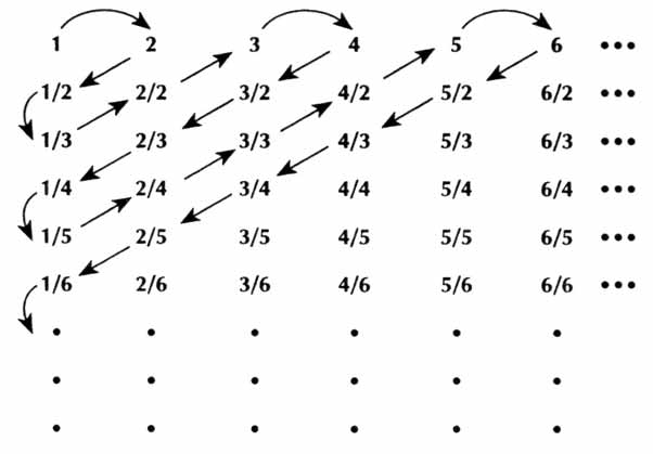 La même question, plus difficile que pour les carrés, se posait pour les rapports entre fractions et nombres rationnels. En effet, on trouve déjà entre 0 et 1 une infinité de nombres rationnels comme, par exemple, la suite 1/2, 1/3, 1/4,… ; et entre chaque nombre naturel et son successeur, il existe également un nombre infini de fractions. L’un des premiers grands travaux du jeune Cantor fut de prouver qu’il y a autant de nombres rationnels que de nombres naturels. Il inventa une méthode spéciale, la « méthode de la diagonale », pour prouver que les nombres rationnels sont en correspondance biunivoque avec les naturels 1, 2, 3, 4,… en dépit du fait qu’il y en ait déjà une infinité entre 0 et 1.