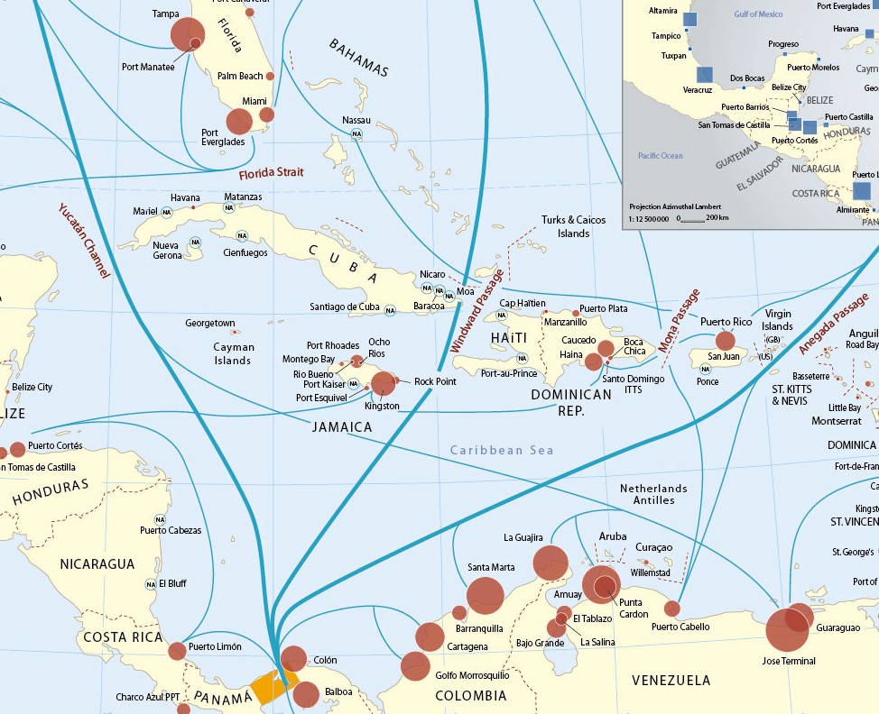 Sur la première carte, nous pouvons observer la zone des Caraïbes, qui est vraiment le carrefour des échanges entre les pays du Pacifique et ceux de l’Atlantique. Les routes maritimes passent désormais par cette région et par le canal de Panama élargi, et par ce qui devrait être un nouveau canal nicaraguayen au niveau de la mer ; ce qui pose les bases pour le développement de grands ports industriels, tels que Ponce, au Porto Rico, et de Mariel à Cuba, pour le transbordement de marchandises, l’augmentation des flux commerciaux de marchandises pour les ports de la côte du Golfe et de la côte atlantique des États-Unis, qui doivent être améliorés et reconstruits à ces fins.