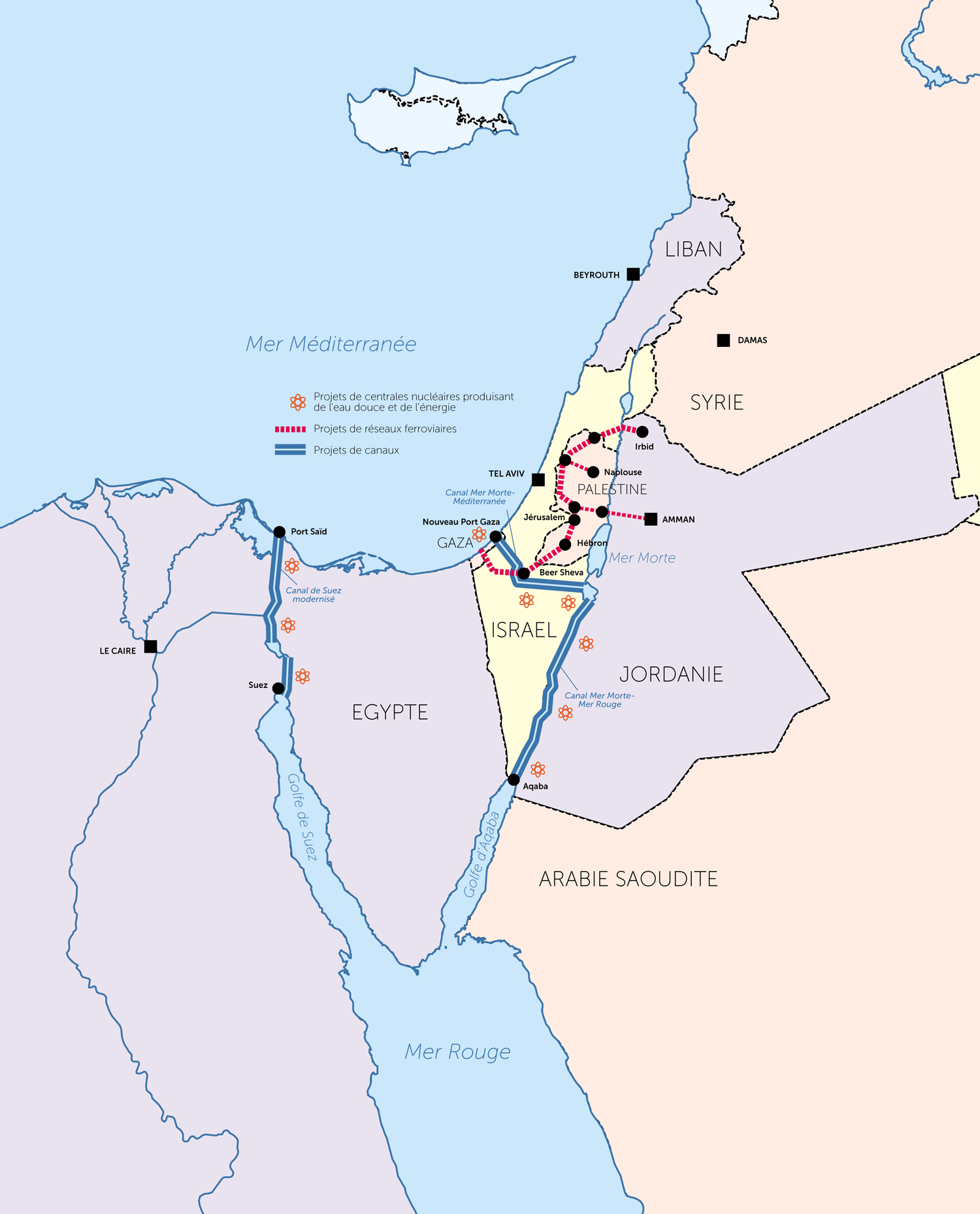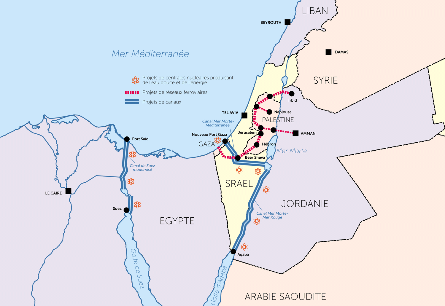 L’urgence était de construire des canaux depuis la Méditerranée et la mer Rouge vers la mer Morte, aux confins d’Israël, la Cisjordanie et la Jordanie, pour rétablir son niveau, et, grâce au dénivelé de 400 mètres entre ces deux points, de générer aussi de l’électricité. La première phase de la construction du canal mer Rouge-mer Morte vient juste d’être lancée par la Jordanie.