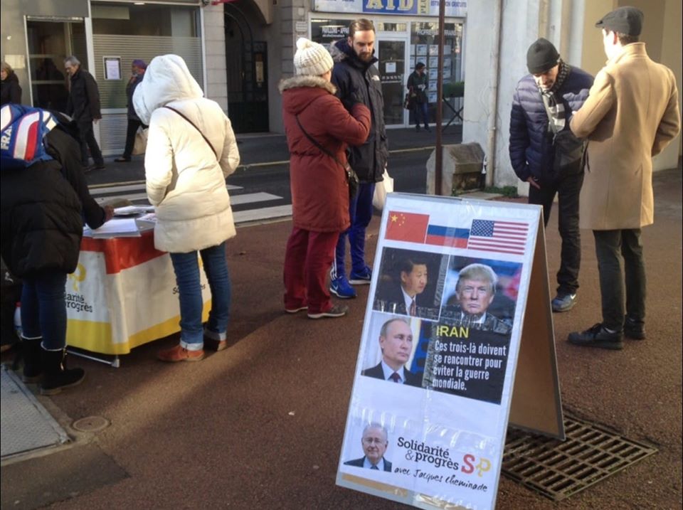 - En France, à Paris, des équipes se sont déployées le 15 janvier près de l’Assemblée Nationale et du Quai d’Orsay, pour convaincre les élus et les responsables de notre action à l’étranger de la nécessité d’appeler à un Sommet de la paix. Après tout, cela entre dans le contexte du Forum de la Paix crée par Emmanuel Macron pour exorciser, lors du centenaire de la guerre de 14-18, les vieux démons de la guerre. Armés de pancartes dénonçant la guerre contre l’Iran et appelant a une approche de paix par le développement économique, les sympathisants de l’Institut Schiller ont pu distribuer leur appel à bon nombre de fonctionnaires du Quai d’Orsay, y compris à des collaborateurs du ministre, ainsi qu’à des attachés parlementaires. Les appels ont été bien reçus, en général, même si les réactions d’impuissance ont été nombreuses : « Que voulez vous ? La France est un petit pays... Nous n’avons pas beaucoup de pouvoir . » Des diplomates des pays émergents, de passage au Quai d’Orsay, étaient , au contraire, en colère de voir que des prétextes du même type avaient été utilisés pour tuer le général Qassam Solemaini et pour déclencher la guerre contre Saddam Hussein : la menace d’attentats à venir contre les ambassades. Pour d’autres, le projet Nouvelles routes de la soie de la Chine est l’alternative à la guerre.