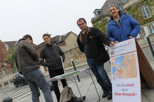 « Quatre militants de Solidarité et Progrès (parti mené par l’ex-candidat à la présidentielle Jacques Cheminade) ont installé un stand, rue de Paris à Compiègne (Oise). Ils veulent sensibiliser les habitants sur l’importance du projet de transport fluvial du canal Seine-Nord, récemment abandonné.
