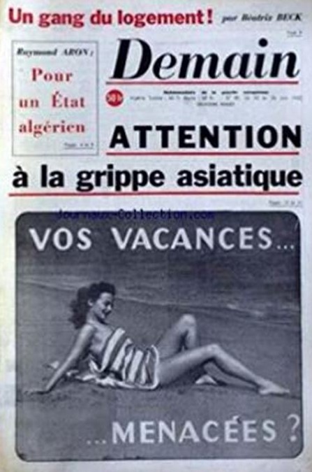 La grippe asiatique (1957-58), due au virus A/H2N2, se caractérise par un nombre élevé de cas de contamination mais aussi par son faible taux de mortalité. Toute la population mondiale sera atteinte en 6 mois. Contrairement à la Covid-19, les personnes de plus de 70 ans sont peu touchées par le mal car elles ont développé une immunité dans l’épidémie précédente, alors que les jeunes sont plus souvent malades, faute d’avoir acquis cet avantage.