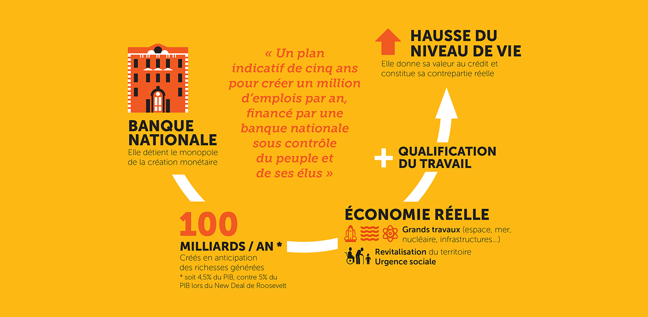 Par un investissement public de 100 milliards d’euros par an, il s’agit de créer un million d’emplois directs chaque année, chaque emploi public créant, en fonction de la qualification croissante, de un à 20 emplois supplémentaires dans le privé par effet d’entraînement, le tout animant une dynamique d’ensemble. Un employé de la poste fait travailler une à deux personnes dans d’autres secteurs, un scientifique de l’ESA en fait travailler 10 fois plus, et sur une durée plus longue.