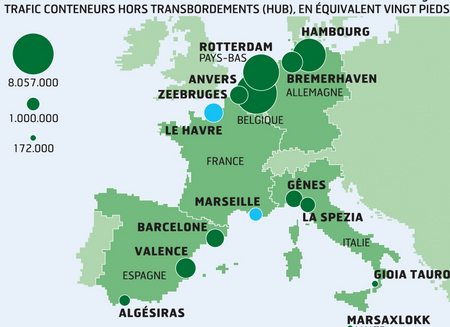 Entre 1989 et 2006, le trafic de conteneurs a doublé en France, pour atteindre 35,6 millions de tonnes en 2006, mais les parts de marché des ports français ont été divisées par deux sur ce segment, pour tomber à 6 %. À Anvers, le trafic de conteneurs a été multiplié par 9 en 25 ans (1990-2015), alors qu’en France, sur la même période, il n’a augmenté que de 2,5 fois.