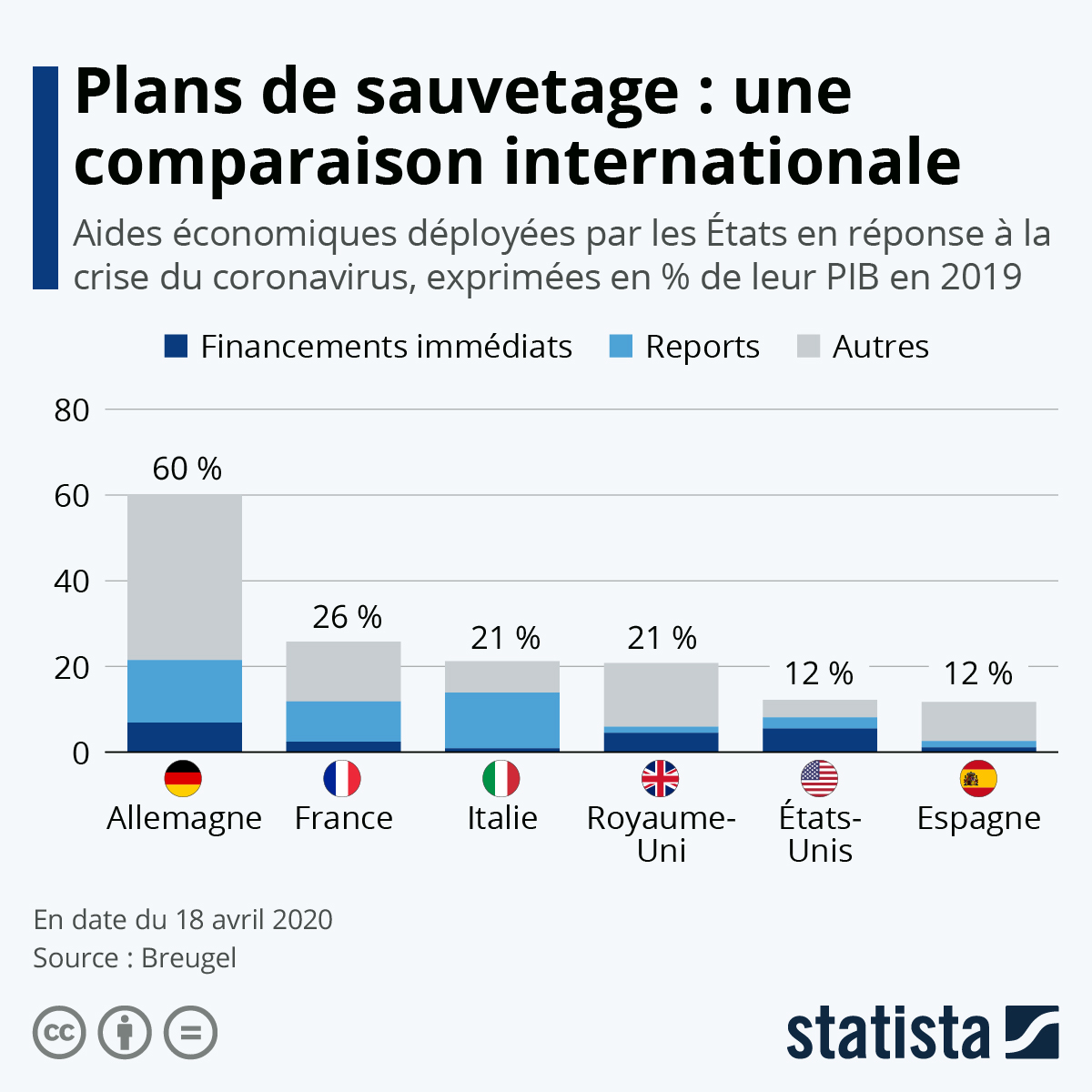 Il mobilisera donc, pour faire repartir l’économie française, 40 milliards d’euros supplémentaires. Au total, pour répondre à cette crise historique qui devrait afficher une baisse d’au moins 11 % du PIB français cette année, Le Maire s’est donc engagé, à ce que l’Etat mette, au global, 450 milliards d’euros sur la table, en « mesures de trésorerie et budgétaires » – soit « l’équivalent de 20 % de notre richesse nationale ».