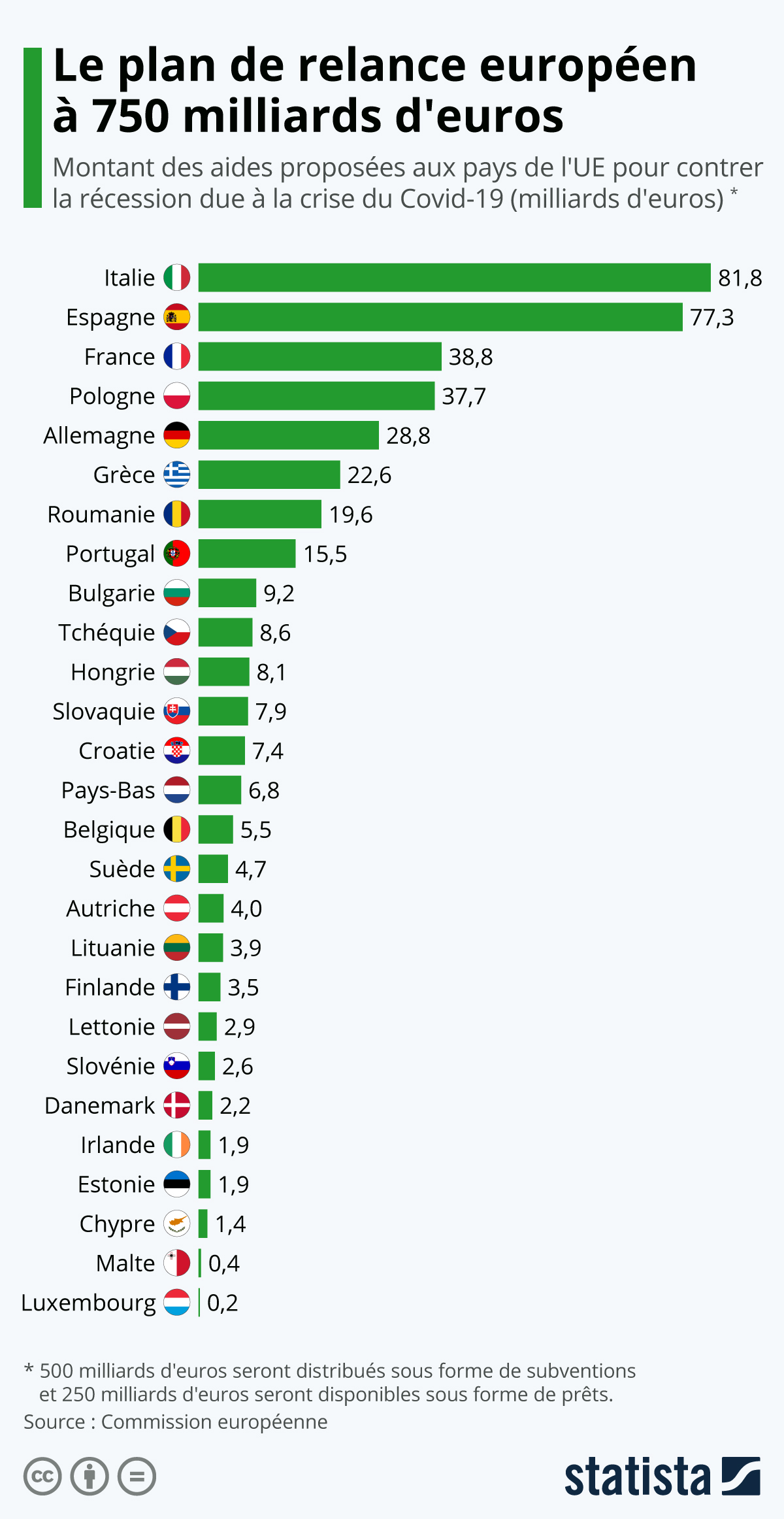 Le sujet est sur la table : la Commission européenne, c’est du jamais vu, ambitionne de lever 750 milliards d’euros sur les marchés. C’est elle qui les distribuera ensuite directement aux Etats et/ou régions, en partie sous forme de dotations et subventions (500 milliards) et en partie sous forme de prêts (250 milliards).
