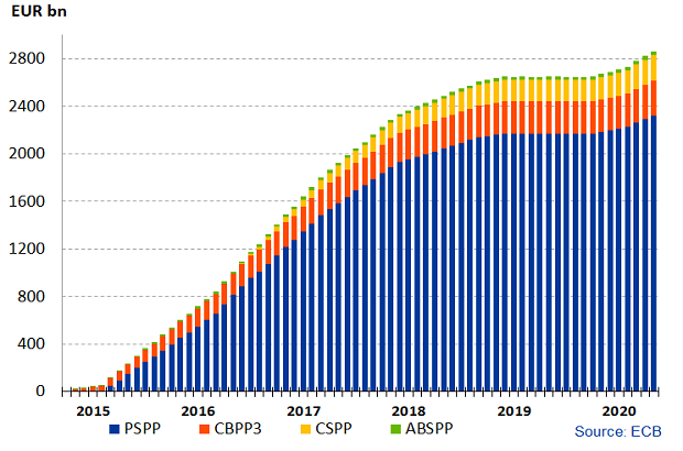 Soulignons que ce PEPP se surajoute au programme déjà existant d’achat d’actifs (Asset Purchase Programme – APP) : depuis fin 2019, la BCE achète déjà 20 milliards d’euros d’actifs par mois aux banques, et ceci dans le cadre de quatre programmes spécifiques :