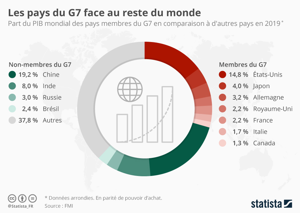 A l’époque, le G7 « pesait » 70 % du PIB mondial, alors qu’aujourd’hui cette part est en dessous des 50 %. En termes de PPP (parité de pouvoir d’achat), le G7 ne représentait plus que 30 % du PIB en 2019, bien moins que celui des BRICS (Brésil, Russie, Inde, Chine et Afrique du Sud). Et ces derniers représentent 41 % de la population mondiale, alors que le G7 n’en représente que 10 %…