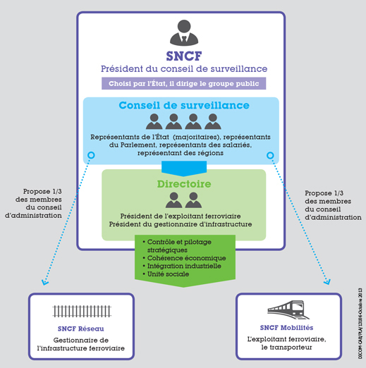 - Pour faire semblant de maintenir un service public, la SNCF mère sera chargée de piloter l’ensemble et d’en définir la stratégie, mais son directoire sera placé sous le contrôle d’un conseil de surveillance, où l’État sera majoritaire.