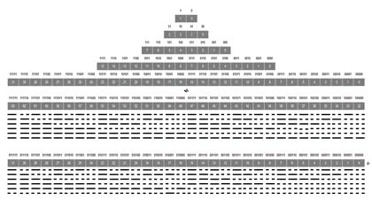 Comme vous l’avez constaté, le Yi Jing utilise ces deux valeurs de base pour représenter des symboles plus élaborés : assemblés, les Yin et les Yang forment des trigrammes et des hexagrammes. Le Yi Jing utilisait le calcul binaire et ces nombres binaires 600 ans avant le traité de Leibniz sur ce système numérique.