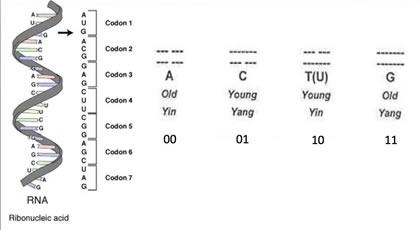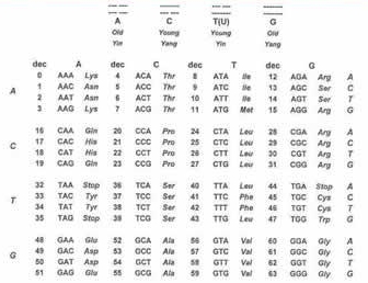 Une triplette de séquences bien précise correspond à la structure protéique d’une partie déterminée des créatures vivantes. Ces instructions formulées avec précision dans la structure ADN définissent la construction génétique des organismes. La somme totale de ces mots de code est le schéma de construction d’un être vivant (avec l’ensemble de ses caractéristiques). Des relations similaires sont progressivement découvertes en lien métaphysique avec la composition génétique des cellules vivantes. Une telle direction de travail pourrait fournir une base scientifique pour expliquer comment le Fengshui, l’astrologie chinoise dérivée du Yi Jing, pourrait affecter les gens et leur descendance à un niveau cellulaire.