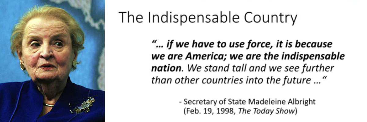 Comment a-t-on pu enchaîner une telle série d’aberrations ? Parce que nous croyons que nous sommes « le pays indispensable ». C’est ce que Madeleine Albright nous a appris, bien avant tout cela. « Si nous devons utiliser la force, c’est parce que nous sommes l’Amérique. » Nous nous tenons debout, là-haut, et nous voyons plus loin que les autres pays dans le futur. Wow ! Nous sommes donc le pays indispensable. Et pour les autres pays ? Quand je pose cette question à des étudiants, ils répondent : « Ils sont ‘dispensables’ ? » Ouais, c’est ça ! L’antonyme d’« indispensable » est « dispensable ». Vladimir Poutine n’a pas été tendre avec le président Obama sur ce point, en déclarant dans une tribune au New York Times qu’il n’était pas du tout d’accord avec l’idée qu’il y ait un pays indispensable dans le monde. Et je dois dire que sur ce point, je suis d’accord avec Poutine.