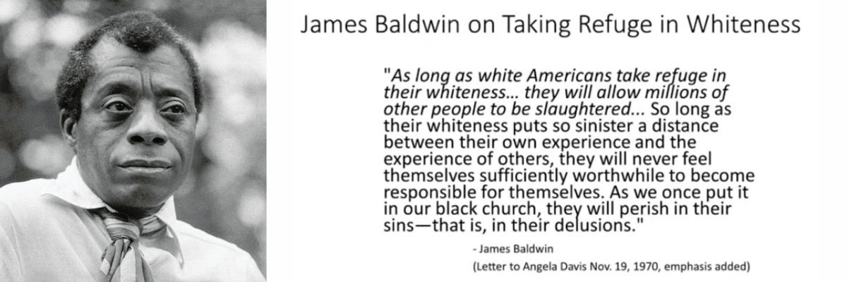 Voilà une chose que la plupart des Américains n’ont probablement jamais entendue. C’était pendant la guerre du Vietnam et Angela Davis venait d’être capturée. Cette militante anti-guerre figurait enchaînée en couverture de Newsweek. Depuis la France, où il s’était réfugié, l’auteur noir James Baldwin lui écrivit : « Tant que les Américains blancs se réfugieront dans leur blancheur, ils permettront que des millions d’autres personnes soient massacrées. Tant que leur blancheur mettra une distance si sinistre entre leur propre expérience et celle des autres, ils ne se sentiront jamais suffisamment indignes pour devenir responsables d’eux-mêmes. Comme nous l’avons dit un jour, dans notre église noire, ‘Ils périront dans leurs péchés’. C’est-à-dire, dans leurs illusions. »