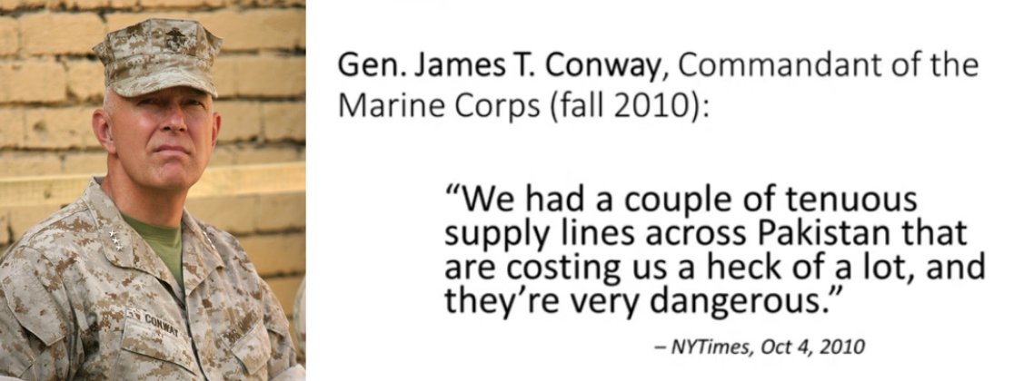 James Conway, le chef du corps des Marines, a dit la même chose. La situation de nos forces était compliquée. Pourquoi ? Il suffit de regarder une carte et d’étudier la géographie du terrain, notamment le relief ! On avait quelques lignes d’approvisionnement précaires passant à travers le Pakistan, qui nous coûtaient très cher en termes de pertes humaines et qui étaient très dangereuses. Vous croyez que les Pakistanais coopéraient avec nous ? Pas du tout, leur objectif était l’opposé du nôtre. Leur priorité était de garder l’Inde hors de l’Afghanistan. Ils encourageaient donc les gens qui combattaient nos troupes en Afghanistan. On prétend que nos généraux ne le savaient pas, eh bien, je laisse à votre imagination le soin de dire si c’est vrai ou pas...