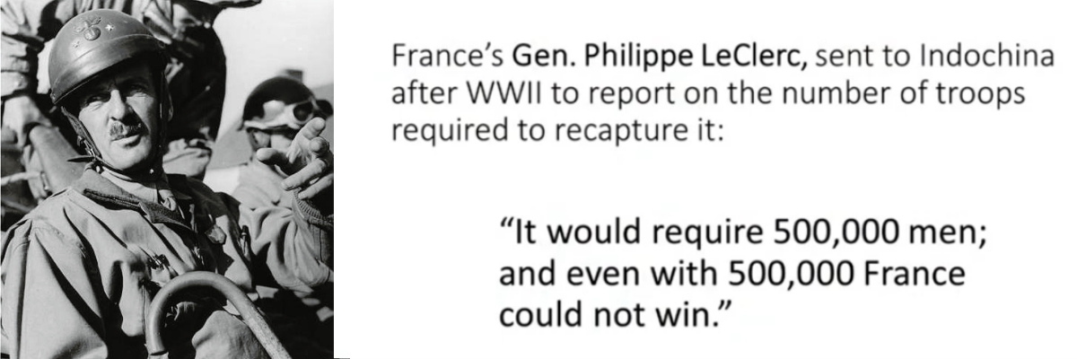 Le général Philippe Leclerc (de Hautecloque, 1902-1947) fut un héros de la Seconde Guerre mondiale. Juste après la fin de la guerre dans le Pacifique, il fut envoyé en Indochine. Interrogé sur le nombre d’hommes qu’il fallait à la France pour récupérer l’Indochine, il avait répondu : « Il faudrait 500 000 hommes, et même avec ça, la France ne pourrait l’emporter. » C’était en 1946.