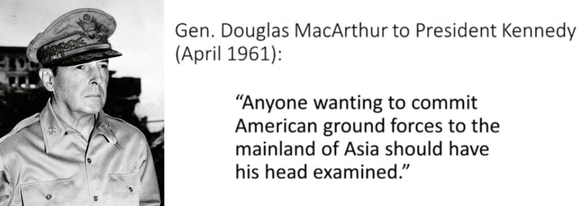 Autre avertissement, celui formulé par le général Douglas MacArthur (1880-1964) au Président John Kennedy : « Quiconque veut engager des forces terrestres américaines sur le continent asiatique devrait se faire examiner par un psy. »