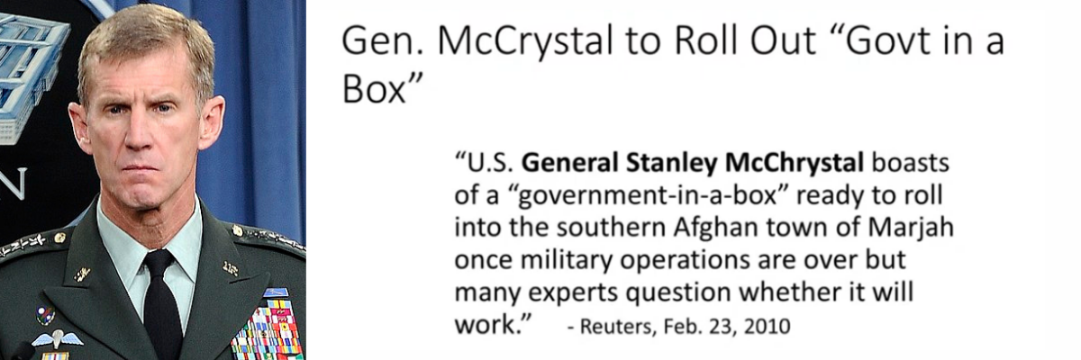 Voici le général Stanley McChrystal. Lui, il savait comment faire… Il allait installer au pouvoir un gouvernement en kit (prêt-à-monter). C’était il y a seulement une décennie, mais certains d’entre vous ne sont pas assez vieux pour avoir connu cela. Il s’est vanté de ce gouvernement en kit, qu’il allait implanter dans la ville de Marjah, dans le sud de l’Afghanistan, quand les opérations militaires seraient terminées... Ah bon ! On était en février 2010. Mais de nombreux experts se sont demandé si ça fonctionnerait, et je suis fier d’avoir été l’un d’eux.