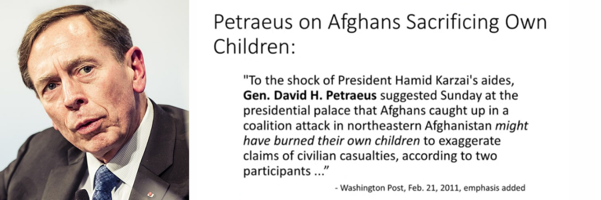 Maintenant, le divin général David Petraeus, si adulé par notre presse. Pour une fois, le Washington Post a eu une illumination et il a écrit : « A la stupéfaction des assistants du président Karzai (Petraeus était en route pour le rencontrer), Petraeus a suggéré dimanche au palais présidentiel que les Afghans [se trouvant] pris dans une attaque de la coalition, dans le nord-est du pays, pourraient avoir brûlé leurs propres enfants pour exagérer les pertes civiles. » Brûler leurs propres enfants ? Quel genre de personnes brûlent leurs propres enfants ? Je veux dire, ils doivent être des sous-humains. C’est le genre de personnes qu’on pourrait qualifier de « dispensables »…