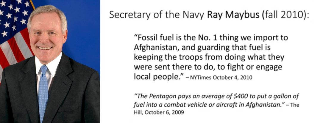 Voici Ray Mabus, secrétaire à la Marine de 2009 à 2017. Il se vantait de la façon dont ses troupes, et ses Marines en particulier, acheminaient du carburant à nos forces en passant par le col de Khyber (passage stratégique entre le Pakistan et la capitale afghane). Les Talibans leur infligeaient de lourdes pertes humaines, mais ils acheminaient, coûte que coûte, le précieux carburant. Et devinez combien ça coûtait ? Seulement 400 dollars le gallon (3,9 litres) [alors que le prix du gallon aux États-Unis n’est que de 3,5 dollars, ndt].