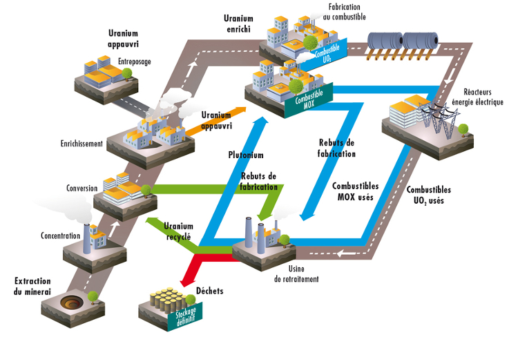 Quatrièmement, une fois que le combustible présent dans les assemblages a été consommé, ceux-ci, contenant les actinides et les produits de fission, sont retirés du réacteur et doivent être entreposés pour une longue période de temps (des milliers sinon des centaines de milliers d’années) dans des sites sécurisés et qui sont stables d’un point de vue géologique.